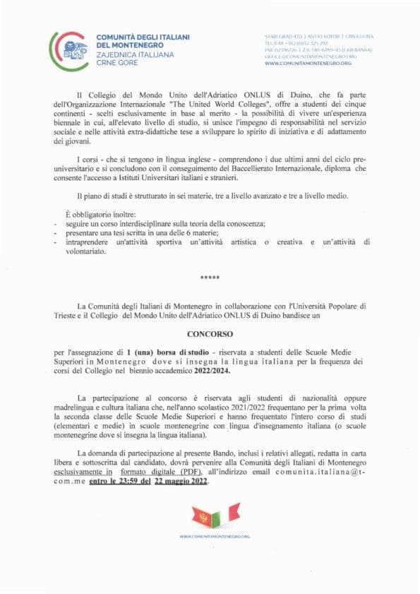 OTVOREN KONKURS ZA DODJELU STIPENDIJE ''COLLEGIO DEL MONDO UNITO DI DUINO'' OTVOREN KONKURS ZA DODJELU STIPENDIJE ''COLLEGIO DEL MONDO UNITO DI DUINO'' Kursevi i obukeOTVOREN KONKURS ZA DODJELU STIPENDIJE ''COLLEGIO DEL MONDO UNITO DI DUINO''OTVOREN KONKURS ZA DODJELU STIPENDIJE ''COLLEGIO DEL MONDO UNITO DI DUINO''